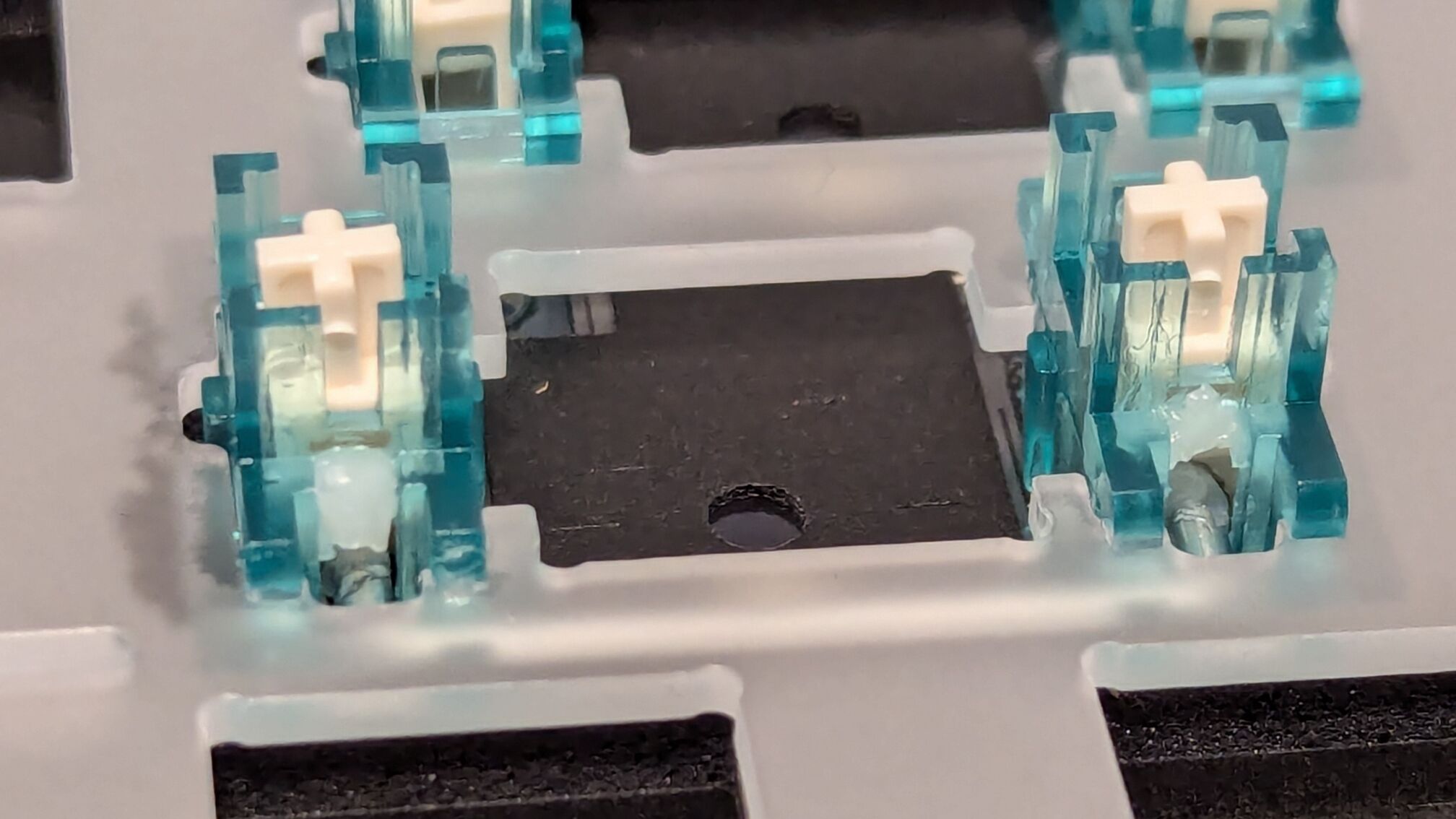I added all of the switches to the keyboard, making sure that the pins on each switch were straight, and pushed firmly down with my thumb. The keyboard does not have pre-cut holes for the switches in the poron layer, but it does have south-facing LEDs. You need to look for the clear LED bar on the switches to orient them before pushing them down.